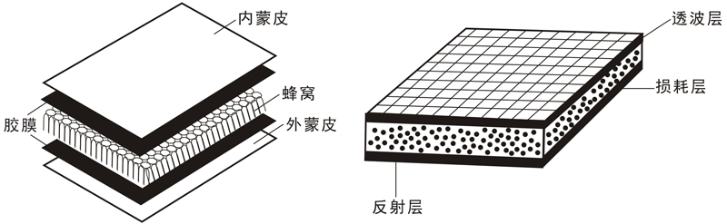 结构隐身材料兼有承载和隐身的双重功能,成为目前隐身材料的主要技术手段。按吸波复合材料结构形式不同,结构吸波材料又可分为两类:层板型吸波复合材料、夹层型吸波复合材料。夹层型吸波复合材料的面板,不仅要求强度高,而且透波性能要好;夹芯多以填充损耗介质的蜂窝、波纹结构材料组成。对于夹层结构的匹配设计,通常由损耗介质的浓度不同来匹配,或者通过设计蜂窝孔格的尺寸,蜂窝的高度变换实现宽频吸收的效果。