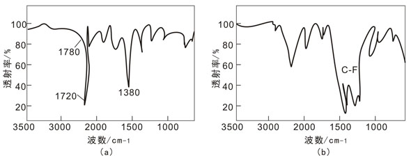 所制得的含氟高耐酸聚酰亚胺纤维的透射红外光谱图(图5-8(a)在1780cm-1、1720cm-1、1380cm-附近有聚酰亚胺的特征吸收峰,全反射衰减红外光谱图(图5-8(b)在波数为100-1300m有碳一氟共价键的吸收峰。X射线光电子能谱图在688eV附近有F元素能谱峰。纤维在浓度为20%(质量分数)硫酸水溶液中浸泡处理240h后测试拉伸强度保持率,未氟化聚酰亚胺纤维只有76%,而氟化聚酰亚胺纤维为94%~98%,耐酸性明显提高。同时,氟化聚酰亚胺纤维保持了优异的耐高温性能和力学性能,可以作为高端的过滤材料使用。这种方法的氟化速率高、处理时间短,可实现连续在线对纤维进行表面处理。